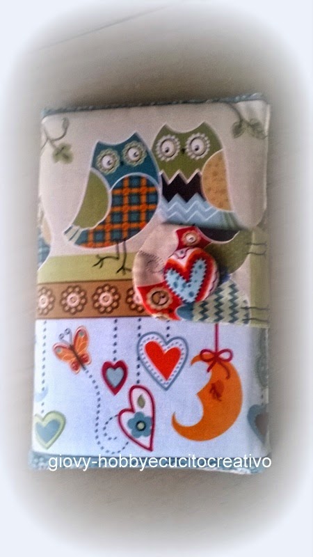 E' semplice e perfetto! Il tessuto è pieno di adorabili gufetti, poi ho fatto una patta e rivestito un bottone con i ritagli avanzati per realizzare la chiusura. Non so come sono riuscita ad azzeccare le misure, ma ci sta a pennello!